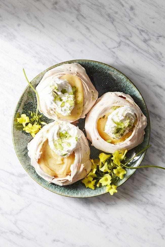 Recipes — Mini Pavlovas with Lemon Curd & Shaved Pistachios | Pretty Party Cake | Creamy Blood Orange Mocktail | Matcha Basque Cheesecake